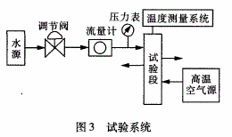 冷卻水由水源流出,經(jīng)調(diào)節(jié)閥調(diào)至合適流量后,進(jìn)入到試驗(yàn)段的閥座矩形槽中,當(dāng)高溫空氣流經(jīng)試驗(yàn)段的閥座中腔通道時,則會與冷卻水進(jìn)行對流換熱。試驗(yàn)段裝有溫度測量系統(tǒng),可對冷卻水和高溫空氣進(jìn)的出口溫度及閥座壁面溫度進(jìn)行測量。