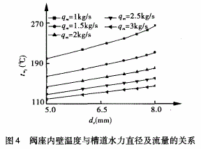 通過試驗(yàn)研究和理論分析得知:最大誤差不超過5%,理論值與實(shí)驗(yàn)值基本吻合。為研究方便,可進(jìn)一步采用對流換熱理論分析不同槽道尺寸及不同冷卻水流量下閥座的換熱特性。